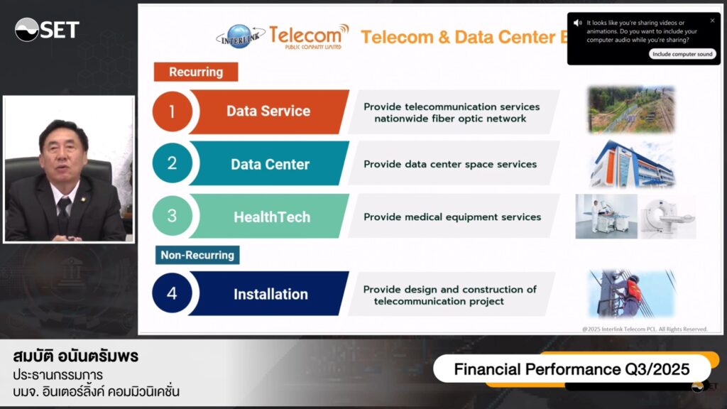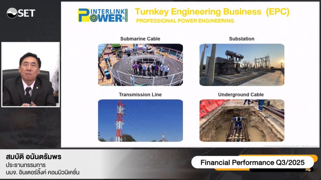 เติบโตชัดเจน วันที่ 18 พฤศจิกายน 2568 บริษัท อินเตอร์ลิ้งค์ คอมมิวนิเคชั่น จำกัด (มหาชน) หรือ ILINK ร่วมนำเสนอผลประกอบการในงาน บริษัทจดทะเบียนพบผู้ลงทุน (Opportunity Day) ประจำไตรมาส 3/2568 จัดโดยตลาดหลักทรัพย์แห่งประเทศไทย (ตลท.) ผ่านระบบออนไลน์ (VDO Conference) โดยมี นายสมบัติ อนันตรัมพร ประธานกรรมการ กลุ่มบริษัท อินเตอร์ลิ้งค์ฯ เป็นผู้ร่วมบรรยาย และตอบข้อซักถามนักลงทุน พร้อมนำเสนอข้อมูลผลการดำเนินงานในช่วง 9 เดือนแรกของปี 2568 และแนวโน้มธุรกิจช่วงโค้งสุดท้ายของปี