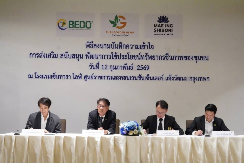 วันที่ 12 กุมภาพันธ์ 2569 สำนักงานพัฒนาเศรษฐกิจจากฐานชีวภาพ (องค์กรมหาชน) หรือ BEDO ประกาศความร่วมมือครั้งสำคัญ ลงนามบันทึกความเข้าใจ (MOU) เพื่อร่วมกันขับเคลื่อนและยกระดับพัฒนา และขยายผลผลิตภัณฑ์เส้นใยธรรมชาติและสีย้อมธรรมชาติจากภูมิปัญญาไทยสู่ระดับอุตสาหกรรมและเชิงพาณิชย์อย่างเต็มรูปแบบโดยได้รับเกียรติจาก ดร.เกษมสันต์ จิณณวาโส ประธานกรรมการ BEDO เป็นประธานในพิธี พร้อมด้วย ดร.ธนิต ชังถาวร ผู้อำนวยการ BEDO นายสุวีร์ งานดี รองผู้อำนวยการ BEDO นายสิทธิชัย เสรีส่งแสง ที่ปรึกษา BEDO ผู้บริหาร และเจ้าหน้าที่ BEDO ร่วมเป็นสักขีพยาน ณ โรงแรมเซ็นทารา ไลฟ์ ศูนย์ราชการและคอนเวนชันเซ็นเตอร์ แจ้งวัฒนะ ความร่วมมือในครั้งนี้มีวัตถุประสงค์หลัก เพื่อสร้าง “ห่วงโซ่คุณค่า” (Value Chain) ให้กับทรัพยากรชีวภาพ โดยอาศัยความเชี่ยวชาญจาก 3 ภาคส่วน ได้แก่: